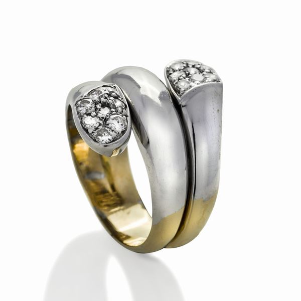 MATERIALE: oro bianco, oro giallo e diamanti DESRIZIONE: anello contrariè realizzato come due serpenti impreziositi da pavè di brillanti PESO: gr 10.4