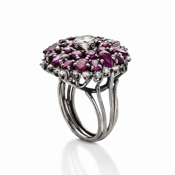 MATERIALE: oro bianco, rubini e diamanti DESCRIZIONE: anello realizzato con al centro diamante taglio brillante interamente incorniciato da due file di rubini, la prima di taglio rotondo e la seconda di rubini taglio goccia e una fascia esterna con diamanti taglio brillante, due piccoli diamante laterale mancanti MISURE: anello 10 PESO: diamante centrale ct 0.65, rubini ct 4.40, diamanti laterali ct 0.85, gr 11.1