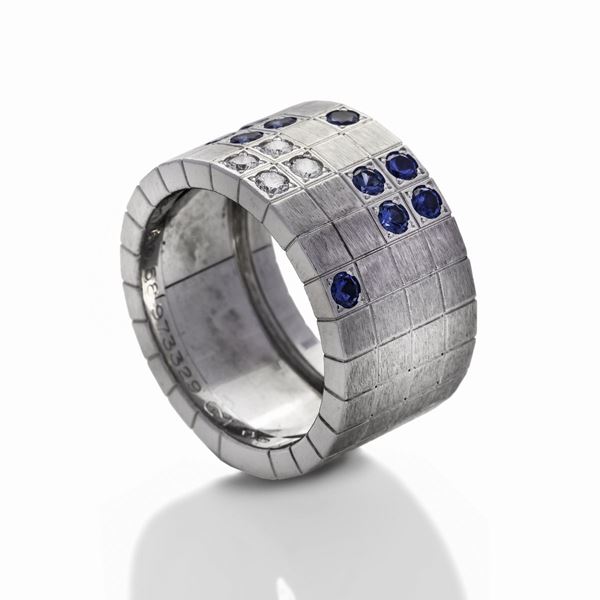 MATERIALE: oro bianco, zaffiri e diamanti DESCRIZIONE: anello a fascia realizzato in oro bianco satinato con motivi a scacchiera, impreziosito da diamanti taglio brillante e zaffiri, firmato Cartier, reca il marchio750 ed i numeri 58 e 973329 MISURE: anello 19 PESO: diamanti ct 0.20, gr 20.8