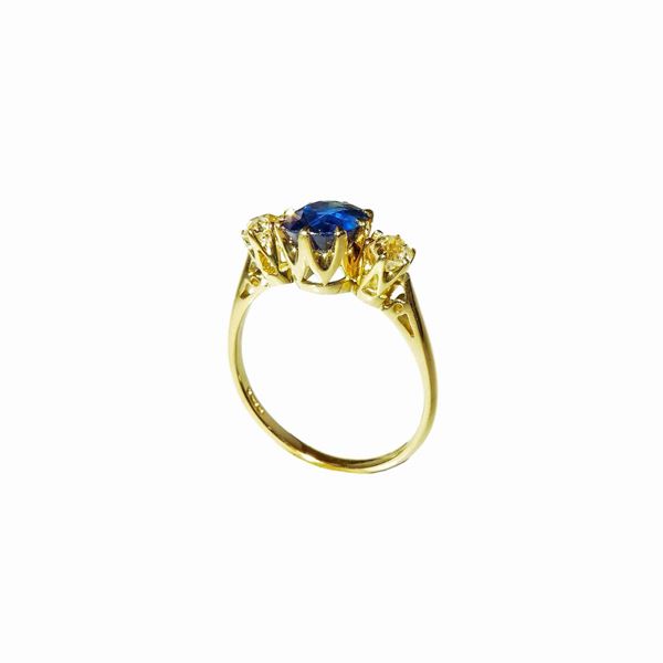 MATERIALE: oro giallo, diamanti e zaffiro naturale DESCRIZIONE: anello realizzato con al centro zaffiro taglio cuscino tra due diamanti taglio vecchio, reca il marchio 750 MISURE: anello 14 PESO: zaffiro naturale ct 1.76, corredato di certificato Gemmological Certification Services, Londra, n. 57763315, del 15/10/2015, gr 2.7