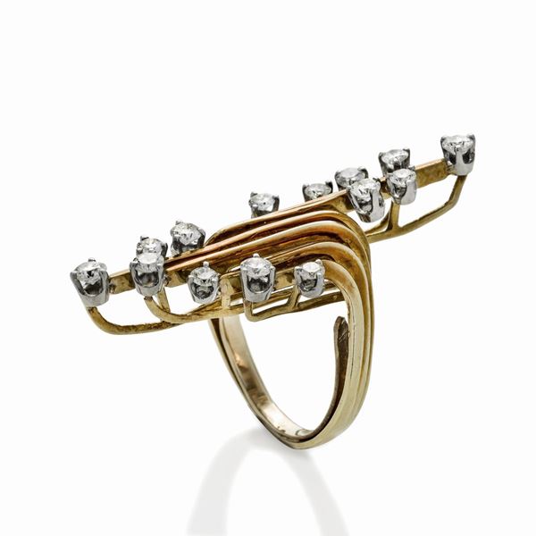 MATERIALE: oro giallo e diamanti DEWSCRIZIONE: anello di ispirazione geometrica reaalizzato come una losanga stilizzata impreziosita da diamanti taglio brillante MISURE: anello 9 PESO: diamanti ct 0.70 circa, gr 9.3