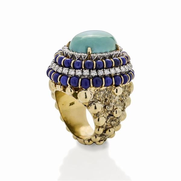 Anello in oro giallo, lapislazzulo, diamanti e turchese