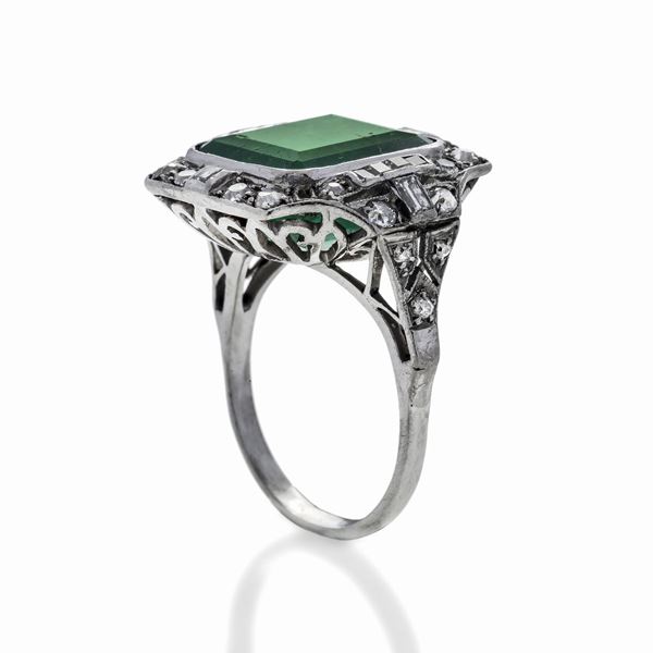 MATERIALE: platino, diamanti e smeraldo DESCRIZIONE: anello realizzato con al centro grande smeraldo taglio quadrato incorniciato da una montatura a tricot con diamanti taglio vecchio e taglio baguette, che si trovano anche ai lati MISURE: anello 14 PESO: gr 8.8