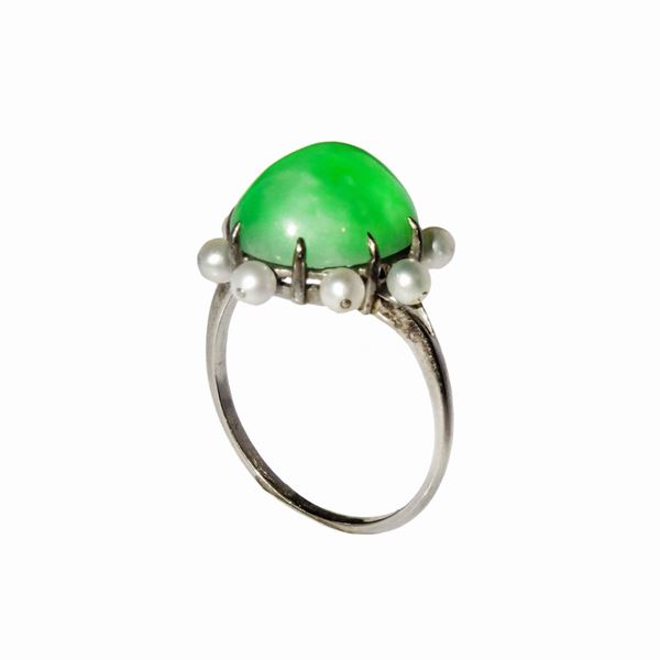MATERIALE: platino, perle naturali e giadeite DESCRIZIONE: anello realizzato con al centro giadeite taglio cabochon incorniciata da otto piccole perle naturali MISURA: anello 17 PESO: giadeite ct 8.5, corredata di certificato Gemmological Certification Services, Londra, n. 7711163, del 11/07/2017, gr 4.1