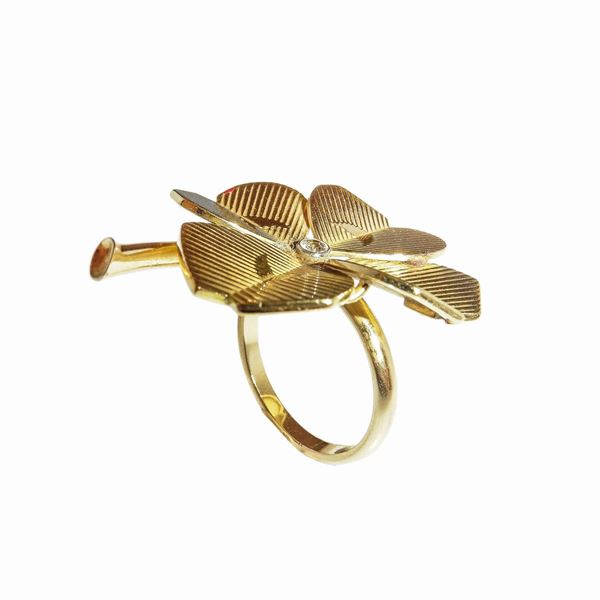 MATERIALE: oro giallo e diamanti DESCRIZIONE: anello realizzato come un quadrifoglio con, foglie incise e al centro diamante taglio brillante, firmato UnoaErre, reca il marchio 750 MISURE: anello 23 PESO: gr 12.7