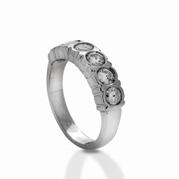 MATERIALE: oro bianco e diamanti DESCRIZIONE: anello riviere con al centro sei diamanti taglio brillante MISURE: anello 15 PESO: diamanti ct 0.90, gr 5.4
