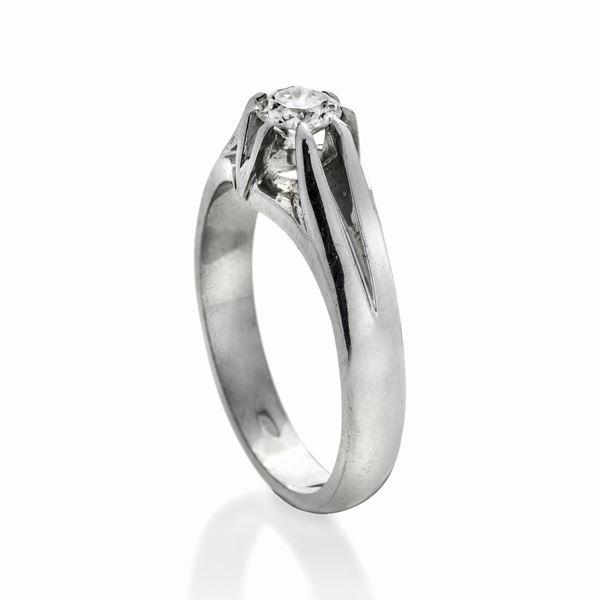 MATERIALE: oro bianco e diamante DESCRIZIONE: anello solitario con al centro diamante taglio brillante, reca il marchio 750 MISURE: anello 22 PESO: diamante ct 0.58, colore L, purezza VS, gr 7.9