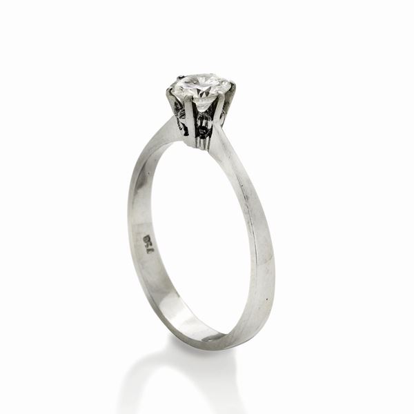 MATERIALE: oro bianco e diamante DESCRIZIONE: anello solitario con al centro diamante taglio brillante montato con sei griffe, reca il marchio 750 MISURE: anello 16 PESO: diamante ct 0.55, colore K, purezza VS1, gr 2.6
