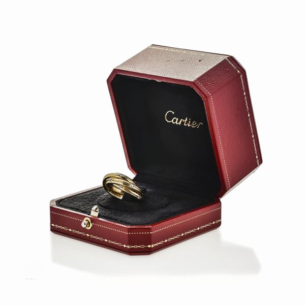 MATERIALE: oro giallo e diamanti DESCRIZIONE: anello Trinity realizzato con tre fedi, ciascunaimpreziosita da diamanti taglio brillante, intrecciate tra loro, corredato di scatola originale, firmato Cartier, reca il marchio 750 ed il numero inciso 48; 752 520 MISURE: anello 8 PESO: diamanti ct 0.30, gr 9.4