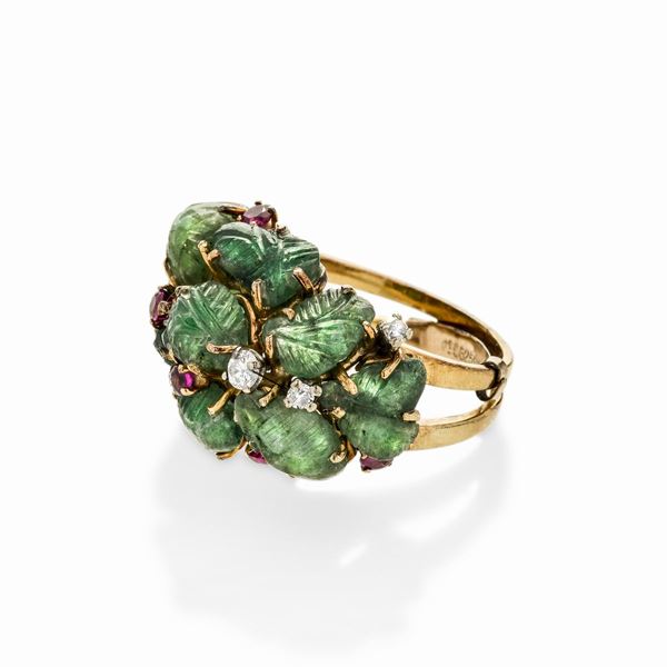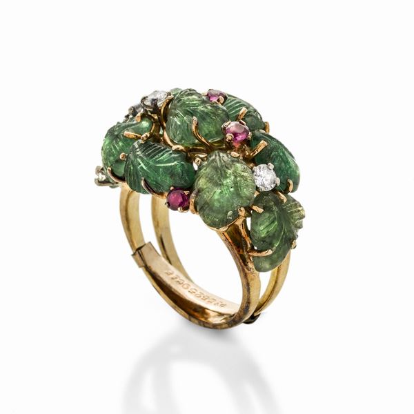 Anello Tutti Frutti in oro giallo, diamanti, rubini e smeraldi