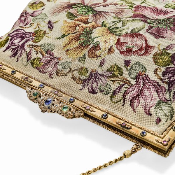 MATERIALE: oro giallo, zaffiri, smeraldi e rubini DESCRIZIONE: borsa da sera, chiusura in oro giallo inciso, realizzata con fiori e foglie alternate a rubini, zaffiri e smeraldi taglio cabochon, cordicella intreccaita in oro ad imitazione della passamaneria, tessuto a fiori, realizzato ad ago con profili in oro, firmata M. Buccellati, reca il marchio 750, pezzo unico MISURE: cm 19.5x13.8