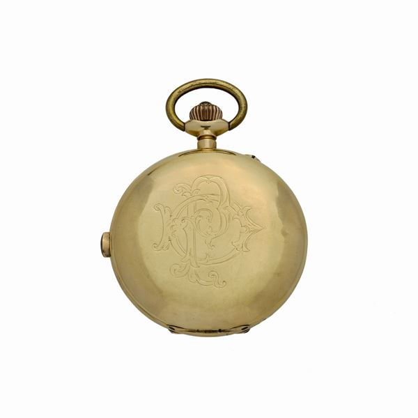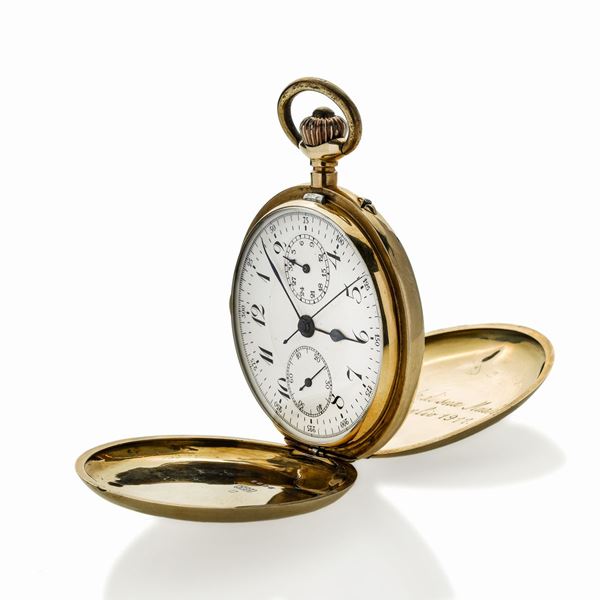 MATERIALE: oro giallo DESCRIZIONE: cronografo da tasca, doppia cassa in oro con dedica incisa nella parte posteriore interna, cassa incisa nella parte esterna con le iniziali PO, quadrante in smalto bianco con numeri arabi in nero, due quadranti supplementari ad ore 3 e 9, lancette douphine, lunetta di carica ad ore 3, movimento a carica manuale, da revisionare MISURE: mm 45 PESO: gr 87.6