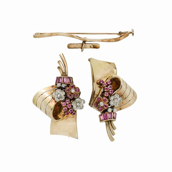 Doppia clips in oro giallo, platino, diamanti e rubini