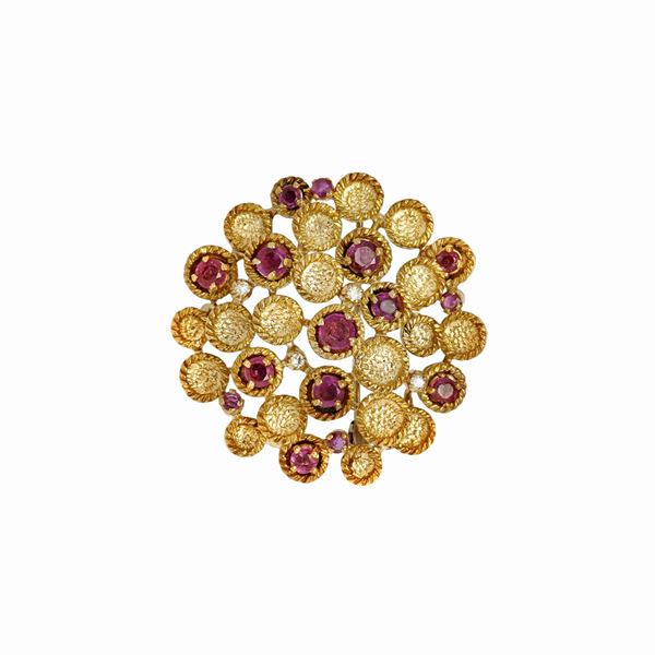 Lotto di paio di orecchini, spilla e anello in oro giallo, diamanti e rubini