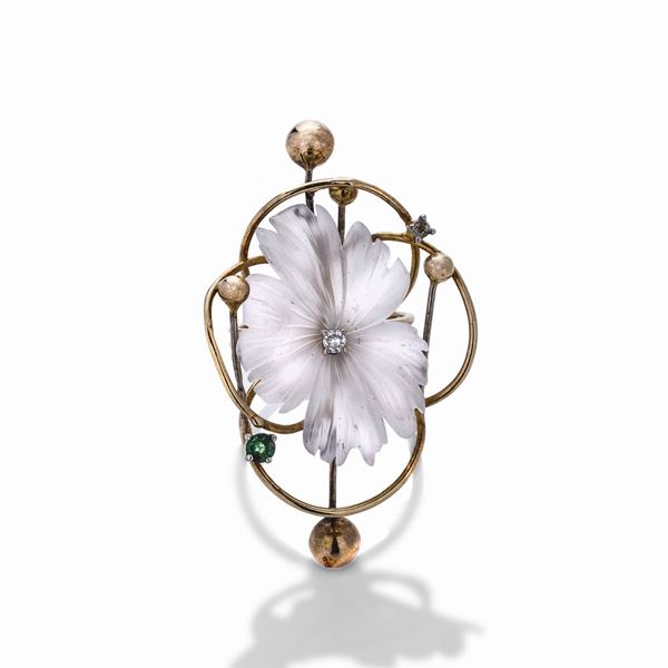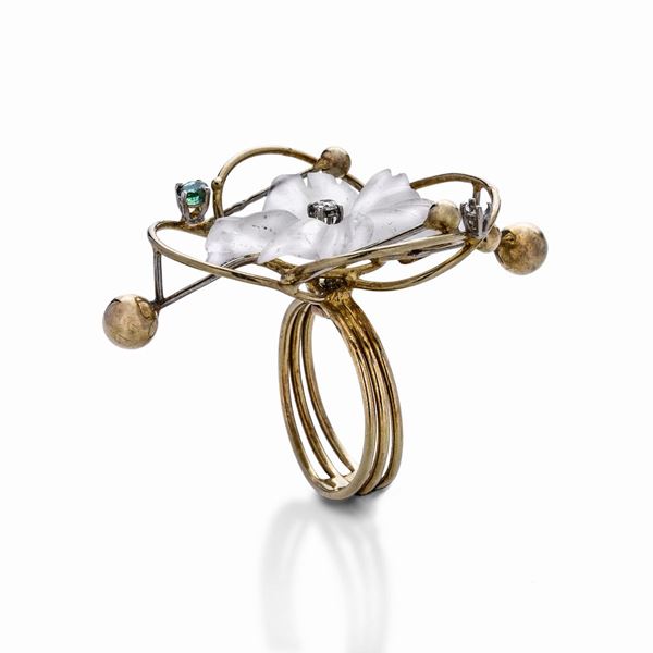 MATERIALE: oro giallo, oro bianco, diamanti, smeraldi e cristallo di rocca DESCRIZIONE: paio di orecchini pendenti, ciascuno realizzato con una clip a vite ed un fiore in cristallo di rocca come pendente, centrato da diamante taglio brillante e sorretto da due segmenti in oro con sfera finale, anello en suite, recano il marchio 750 MISURE: orecchini cm 3.3x7.4, anello 12 PESO: orecchini gr 14.9, anello gr 8.0
