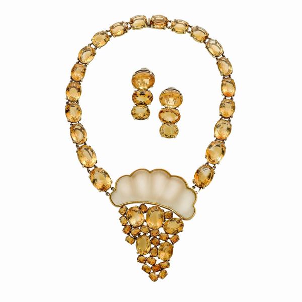 Paio di orecchini e Collier in oro giallo, cristallo di rocca e quarzi citrini