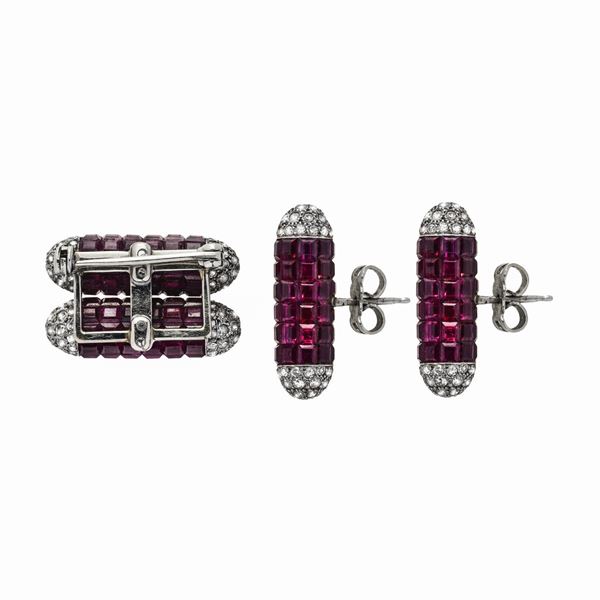 Paio di orecchini e spilla in oro bianco, diamanti e rubini