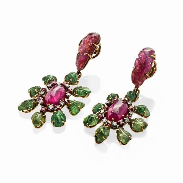 Paio di orecchini Tutti Frutti in oro giallo, diamanti, smeraldi e rubini