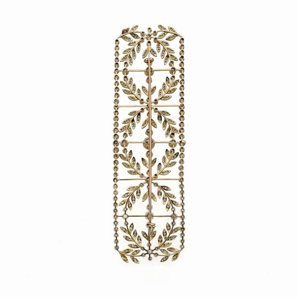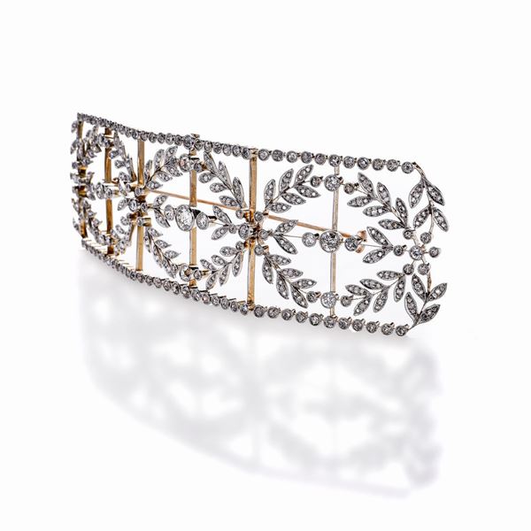 MATERIALE: oro giallo, platino e diamanti DESCRIZIONE: parte di tiara realizzata a girandole, di ispirazione settecentesca, con serti di alloro intrecciati, interamente impreziosito da diamante taglio vecchio, trasformato in spilla in epoca posteriore MISURE: cm 13.5x4 PESO: diamante centrale ct 1.0, colore H, purezza VS1, gli altri diamanti ct 5.20, colore H, purezza SI, gr 49.1