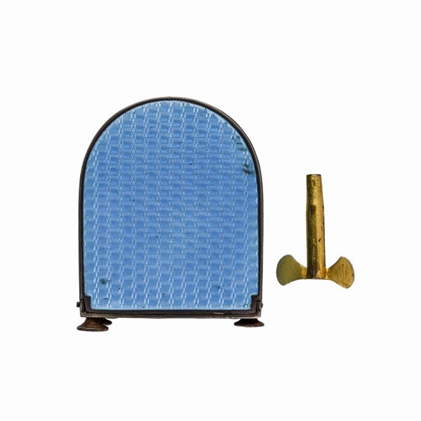 MATERIALE: metallo dorato, metallo e smalto azzurro DESCRIZIONE: piccolo orologio da tavolo realizzato ad arco, quadrante dorato, eseguito a sbalzo con motivi floreali, numeri arabi in porcellana e smalto nero, lancette douphine, movimento a carica manuale, corredato di chiavetta originale, interamente rivestito in smalti nei toni dell' azzurro a formare un motivi a nastro, reca due punzoni di difficile lettura e inciso, mancante di un piedino ROZ MISURE: cm 3.5x5 PESO: 122.5
