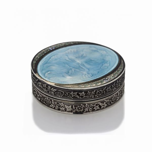 MATERIALE: argento e smalto nei toni dell' azzurro, del bianco, del verde e del nero DESCRIZIONE: portapillole con coperchio con volto di bacco in smalto azzurro incorniciato da tranci di alloro in smalti policromi, fascia laterale incisa con volute contrapposte MISURE: diametro cm 3.3 PESO: gr 18.2