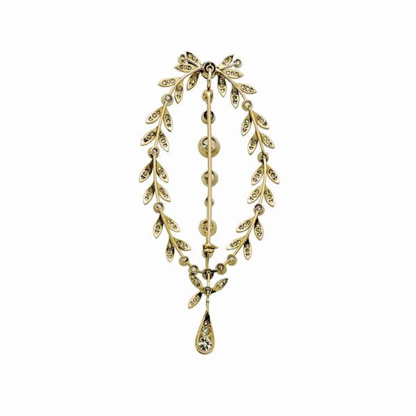 MATERIA: oro bianco, oro giallo e diamanti DESCRIZIONE: spilla di ispirazione floreale realizzata come un serto di alloro centrato da barretta impreziosita da otto diamanti taglio vecchio, interamente abbellita da diamanti taglio vecchio, con goccia pendente centrata da diamante taglio vcchio, una piccola foglia mancante MISURE: cm 4x8.5 PESO: diamante centrale ct 0.70, colore H, purezza VS, gli altri diamanti ct 3.0, colore H, purezza SI, gr 15.3