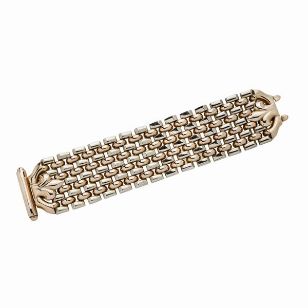 MATERIALE: oro rosa e oro giallo DESCRIZIONE: alto bracciale, ad imitazione del tessuto, realizzato con maglie bombate in oro rosa alternate a maglie rettangolari in oro giallo, grande fermezza a barretta impreziosita da due gigli ai lati, reca il marchio 750 e bolli risalenti all'epoca del fascio MISURE: aperto cm 19.5 PESO: gr 109.1