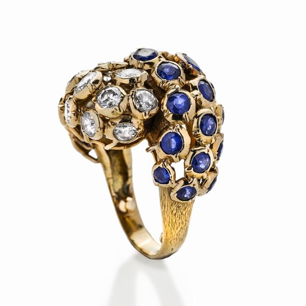 Anello contrariè in oro giallo, diamanti e zaffiri