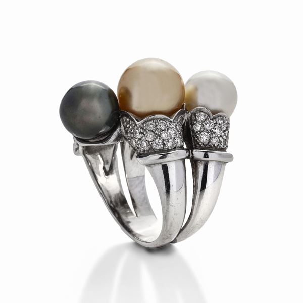 Anello in oro bianco, diamanti e perle, perla thaiti e perla gold