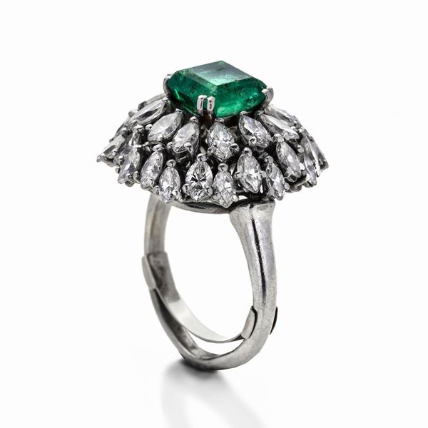 MATERIALE: oro bianco, diamanti e smeraldo DESCRIZIONE: anello realizzato con al centro smeraldo taglio rettangolare impreziosito da due file di diamanti taglio navette MISURE: anello 13.5 PESO: diamanti ct 4.0, colore H, purezza VS, smeraldi ct 2.0, leggermente danneggiato, gr 12.5