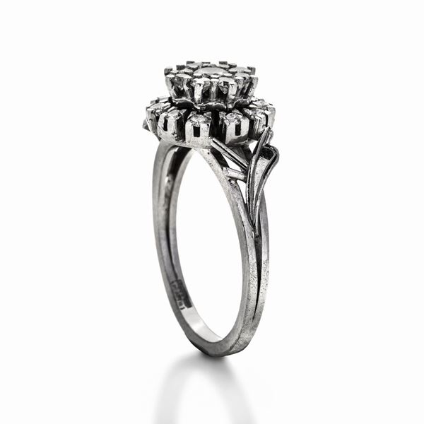 MATERIALE: oro bianco e diamanti DESCRIZIONE: anello realizzato con diamante centrale circondato da due file di diamanti sorrette da foglie, reca marchio 750 MISURE: anello 17 PESO: diamanti ct 0.50 gr 5.5
