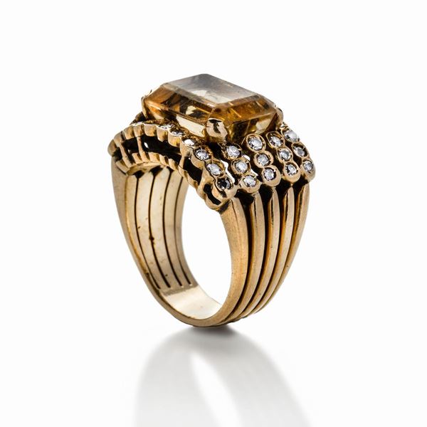MATERIALE: oro giallo, diamanti e quarzo citrino DESCRIZIONE: anello realizzato con al centro quarzo citrino taglio smeraldo su base inpreziosita da cinque file di diamanti taglio wit wit MISURE: anello 10 PESO: gr 11.9