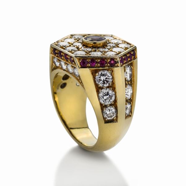 MATERIALE: oro giallo, diamanti e rubino DESCRIZIONE: anello esagonale, realizzato con al centro rubino incorniciato da diamanti taglio brillante, su alta base abbellita da rubini, ogni lato è impreziosito da due fasce di diamanti taglio brillante che ritroviamo anche sulla base, reca il marchio 750 MISURA: anello 15.5 PESO: rubino ct 1.52, diamanti ct 4.16, colore G-H, purezza VVS, gr 23.5