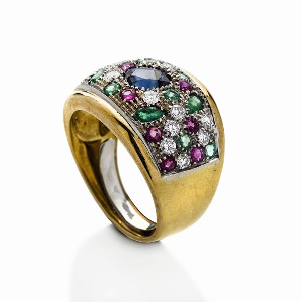 Anello in oro giallo, diamanti, smeraldi, rubini e zaffiri