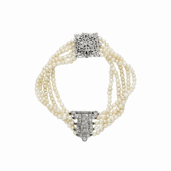 MATERIALE: oro bianco, microperle e diamanti DESCRIZIONE: bracciale realizzato con cinque fili di piccole perle, nel centro clip in oro impreziosita da diamanti taglio vecchio, fermezza quadrata a tricot con foglie traforate MISURE: cm 19.0 x 2.2 PESO: diamanti ct 0.60 gr 22