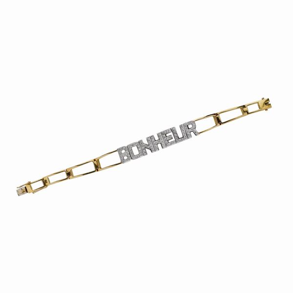 materiale: oro giallo, oro bianco e diamanti DESCRIZIONE: bracciale realizzato con maglie rettangoalri degradè, con al centro la scritta Bonheur interamente impreziosita da diamanti taglio brillante, reca il marchio 18 kt MISURE: aperto cm 18 PESO: diamanti ct 1.20, gr 26.5