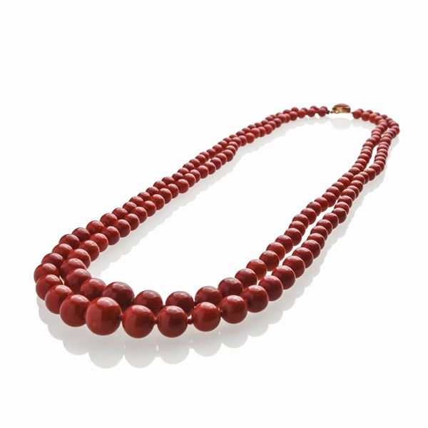 MATERIALE: corallo rosso e oro giallo DESCRIZIONE: collana in oro giallo e corallo rosso, a due fili, con sfere a scalare, e fermezza ovale con al centro corallo taglio cabochon MISURE: cm 62, sfere centrali mm 12 PESO: gr 88.4