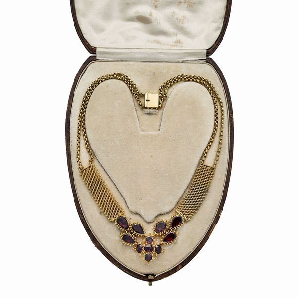 MATERIALE:oro giallo e granati DESCRIZIONE: collier realizzato nelle parti laterali con due catene che si collegano ad una fascia in oro ad imitazione del tessuto, parte centrale con tre maglie a goccia, ciascuna con granato, che incorniciano una croce anch'essa in granati, corredato di scatola originale MISURE: aperta cm 39 PESO: gr 30.7