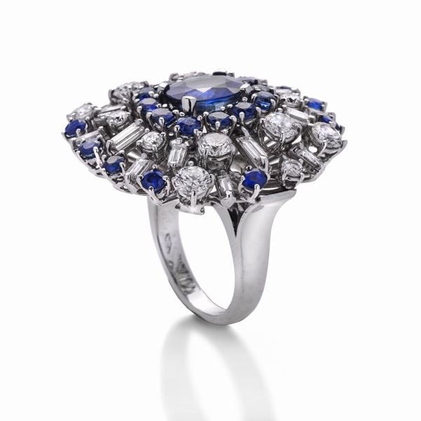 Grande anello in oro bianco, diamanti e zaffiri