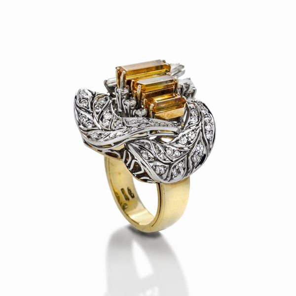 Grande anello in oro bianco, oro giallo, diamanti e topazi gialli