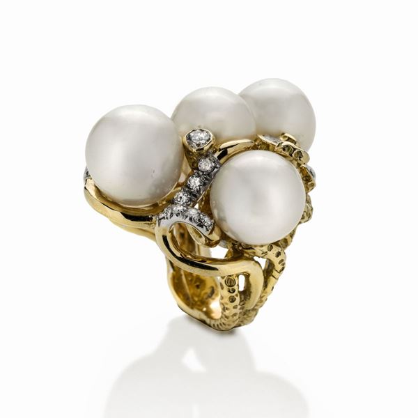 MATERIALE: oro giallo, oro bianco, diamanti e perle australiane DESCRIZIONE: grande anello realizzato con al centro cinque perle australiane impreziosite da diamanti taglio brillante MISURE: anello 17 PESO: perle diam da mm 13 a 14.5, diamanti ct 1.50, gr 58.1