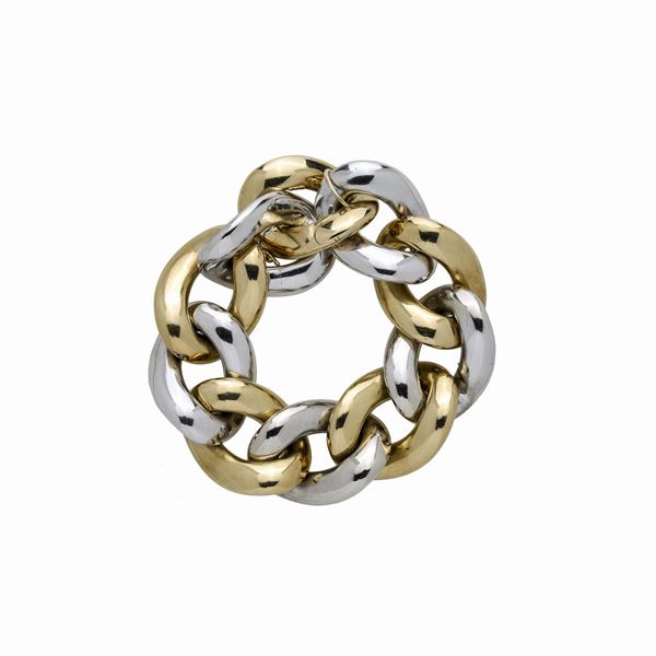 MATERIALE: oro giallo e bianco DESCRIZIONE: grande bracciale realizzato con maglie a barbazzale di diverso colore intrecciate tra loro MISURE: aperto cm 22 PESO: gr 118.5