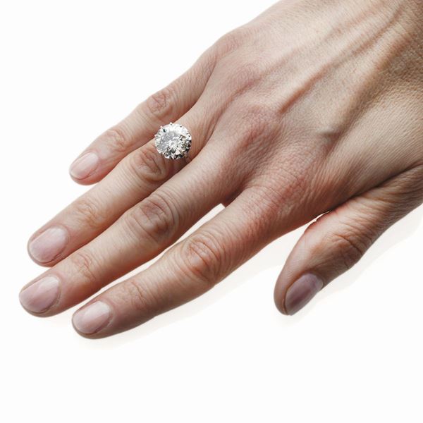 MATERIALE: oro bianco e diamante DESCRIZIONE: importante anello solitario con al centro diamante taglio vecchio europeo montato con griffe su lata base trasforata con motivo ad arco MISURE: anello 12.5 PESO: diamante ct 4.75 (diametro medio 11.21mm, altezza 6.32 mm) colore J-K, purezza SI1, leggerissima scheggiatura vicino ad una punta, gr 4.2