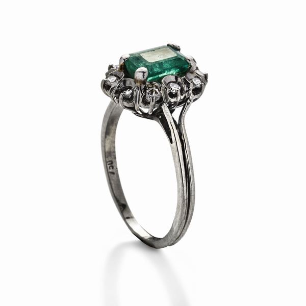 MATERIALE: oro bianco, diamanti e smeraldi DESCRIZIONE: paio di orecchini, ciascuno con smeraldo taglio rettangolare incorniciato da piccoli diamanti taglio brillante, anello en suite MISURE: orecchini cm 0.7x0.7, anello 13 PESO: smeraldi ct 0.50 gr 6.0