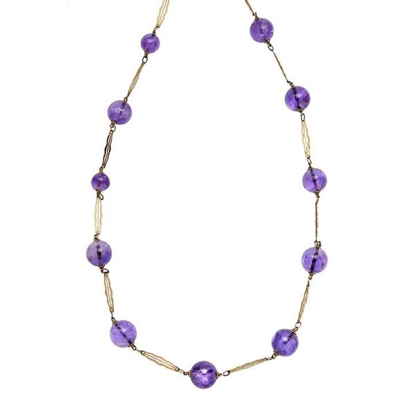 MATERIALE: oro giallo e ametista DESCRIZIONE: collana a maglie traforate intervallata da sfere di ametista di due diametri MISURE: cm 130, ametista mm 15 e 11 PESO: gr 129