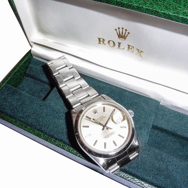 MATERIALE: acciaio DESCRIZIONE: orologio da polso, cassa con fondello e coroma a vite, lunetta liscia, quadrante avorio con indici applicati e lancette a bastone, datario ad ore 3, movimento a carica automatica, bracciale a maglie Oyster con chiusura deployante, corredato a scatola originale MISURE: quadrante diam. mm 34
