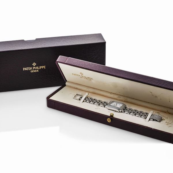 MATERIALE: oro bianco e diamanti DESCRIZIONE: orologio da signora con ghiera impreziosita lateralmente da diamanti, quadrante rettangolare in smalto bianco, indici in diamanti, lancette a bastone, movimento al quarzo, cinturino in oro bianco Patek Philippe, corredato di doppia scatola originale e maglie in oro a parte MISURE: aperto cm 15.5, quadrante mm 21, referenza n. 4825