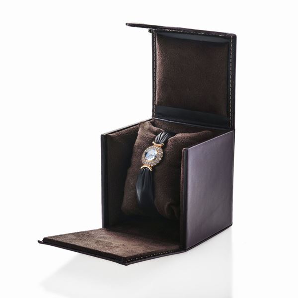 MATERIALE: oro giallo e diamanti DESCRIZIONE: orologio con ghiera bombata con pavè di brillanti, quadrante in smalto azzurro, lancette a bastone, vetro molato ad imitazione del brillante, movimento al quarzo, cinturino originale imbottito in pelle nera, chiusura in oro giallo firmata Audemars Piguet 750, inciso sulla cassa numero C 46482, corredato di scatola originale in pelle marrone MISURE: diametro mm 20