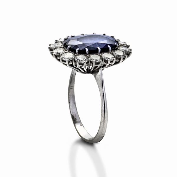 MATERIALE: oro bianco, diamanti e zaffiro australiano DESCRIZIONE: anello a margherita realizzato con al centro zaffiro taglio ovale incorniciato da diamanti taglio brillante, reca il marchio 750 MISURE: anello 16 PESO: zaffiro ct 4.50, diamanti ct 1.40, colore G-H, purezza VS-SI, gr 5.6