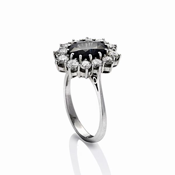 MATERIALE: oro bianco, diamanti e zaffiro DESCRIZIONE: anello a margherita realizzato con al centro zaffiro taglio ovale incorniciato da diamanti taglio brillante, reca il marchio 750 MISURE: anello14 PESO: diamanti ct 1.20, gr 5.2